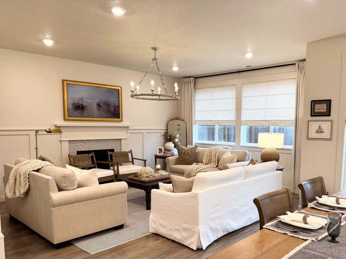 A dual-layer Roman shade offering flexible light control and privacy from day to night.