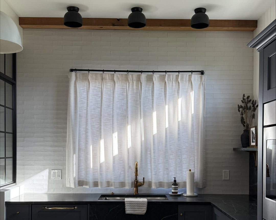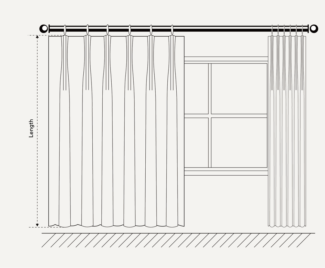Curtains extend 1" onto the floor, creating a soft, intentional puddle instead of hanging straight. Not recommended for curtains that are opened and closed frequently, as the extra fabric can collect dust more easily.