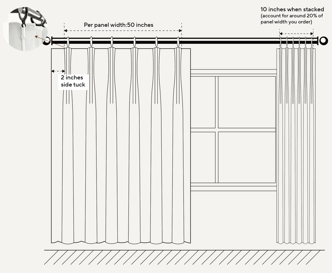 Pleat fullness is different from regular curtain fullness. Because pleats fold in part of the fabric, making pleated curtains already requires about double the fabric width. To create more pleats and a fuller look, we recommend adding an additional multiplier to your desired finished width. This gives the pleats a richer, more luxurious appearance.